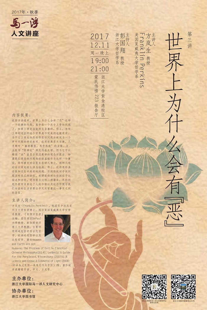 方岚生(Franklin Perkins),美国宾夕法尼亚州立大学哲学博士,现任美国夏威夷大学哲学系教授、《东西方哲学》主编。曾任美国DePaul大学教授、新加坡南洋理工大学教授。主要研究领域包括中国古代哲学、欧洲近代哲学以及比较哲学。著有Heaven and Earth are not Humane: The Problem of Evil in Classical Chinese Philosophy(2014)、Leibniz: A Guide for the Perplexed, Bloomsbury (2007)以及Leibniz and China: A Commerce of Light (2004) (中译本《互照—莱布尼茨与中国》)等,著作被译成葡萄牙语、中文、 日文等。