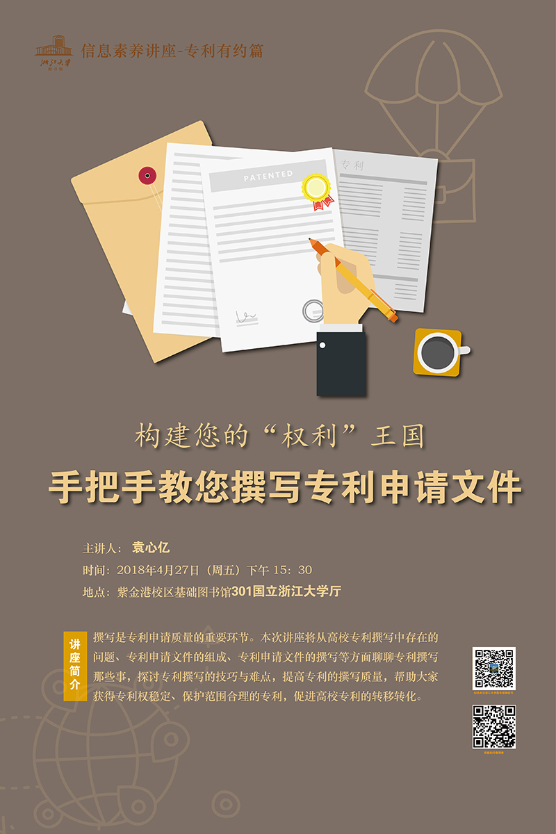 由张雅群老师主讲的第一讲“为技术创新撑起专利的保护伞——从认识专利到申请专利”已在上周五顺利完成,如果当时没能赶上也不必遗憾哦,讲座课件已在图书馆主页(http://libweb.zju.edu.cn/libweb/redir.php?catalog_id=10244)挂出,讲座视频也即将上线,有需要的老师同学可以关注。