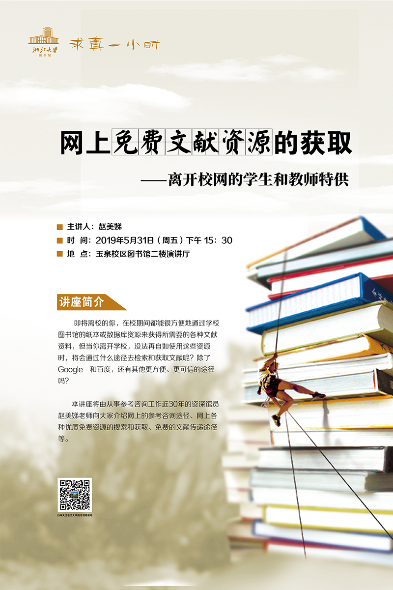 讲座简介:即将离校的你,在校期间都能很方便地通过学校图书馆的纸本或数据库资源来获得所需要的各种文献资料,但当您离开学校,没法再自如使用这些资源时,将会通过什么途径去检索和获取文献呢?除了Google 和百度,还有其他更方便、更可信的途径吗?本讲座将由从事参考咨询工作近30年的资深老馆员赵美娣老师向大家介绍网上的参考咨询途径、网上各种优质免费资源的搜索和获取、免费的文献传递途径等。