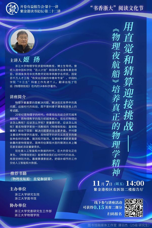 “书香浙大”阅读文化节之“开卷有益”报告会将邀请来自各学科的阅读导师分享个人阅读经验,带领读者一起感受多学科、深阅读的魅力,激发同学们的阅读热情,让读者在书页翻动间,遇见更辽阔的自己。