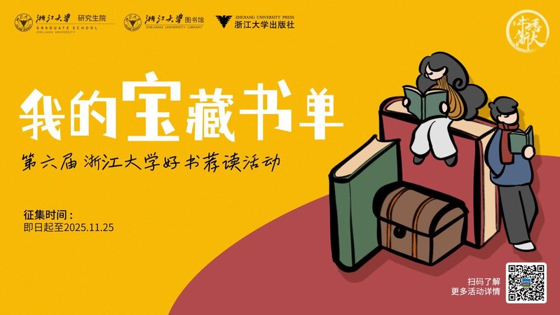 为增进师生的阅读兴趣,建设书香校园,作为2025浙江大学“书香浙大”阅读文化节系列活动之一,浙江大学研究生院、浙江大学图书馆、浙江大学出版社举办我的宝藏书单——第六届浙江大学好书荐读活动。现将活动事宜通知如下,欢迎大家踊跃投稿。