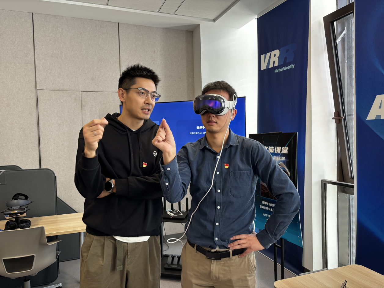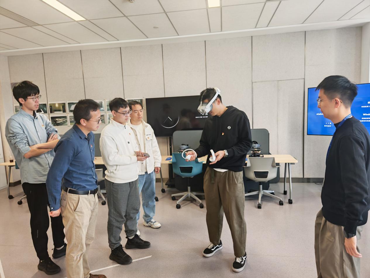 首先在X-Lab沉浸式体验了四类前沿扩展现实设备。有同学表示:X-Lab虚拟现实科技空间带来了强烈震撼,不仅直观感受到了虚拟现实的魅力,更对这项技术的应用前景充满了无限遐想。VR体验为学生们提供了“沉浸式、互动性、创新性”的新路径,既符合学生的认知规律与兴趣特点,又能精准对接时代对人才的核心要求,为我们的传统教育补充了重要的升级方向。