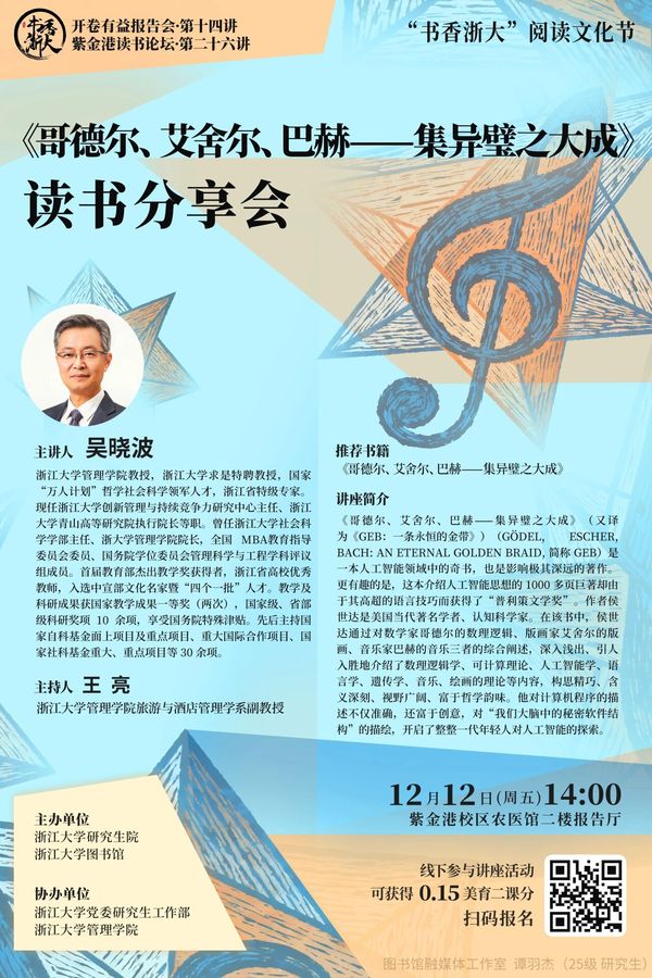 “书香浙大”阅读文化节之“开卷有益”报告会将邀请来自各学科的阅读导师分享个人阅读经验,带领读者一起感受多学科、深阅读的魅力,激发同学们的阅读热情,让读者在书页翻动间,遇见更辽阔的自己。