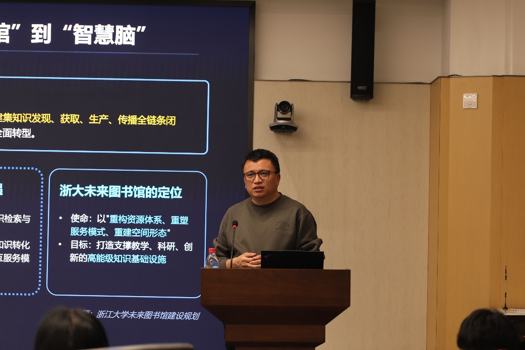 图书馆副馆长张紫徽以《未图千问:AI赋能图书馆知识服务新范式》为题,深度剖析了人工智能时代图书馆的使命变革与发展方向,系统阐述了AI技术与图书馆业务融合的核心维度,明确了“分步引入、场景驱动”的实践理念。他指出,要以AI大模型为技术支撑,以跨媒体大数据为核心资源,通过多模态服务手段,构建覆盖知识发现、获取、生产与传播全链条的智能化知识服务体系,推动图书馆向数据中心、知识中心与语料中心的全面转型。