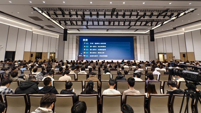 本次报告会,俞老师从自身专业学科阅读的经历出发,紧扣人类能源演进历程与当下绿色能源转型的时代命题,系统解读了《能源传:一部人类生存危机史》的书本内容。他以“动力的革命”“光亮的追寻”“新的火种”为三大板块,通过大量历史案例,逐步梳理了从木材到煤炭、从电力到石油、从核能到可再生能源的变革脉络。最终,俞老师以史为鉴,不仅深入剖析能源危机与生态教训,还引导在场师生共同思考AI时代能源的发展方向。